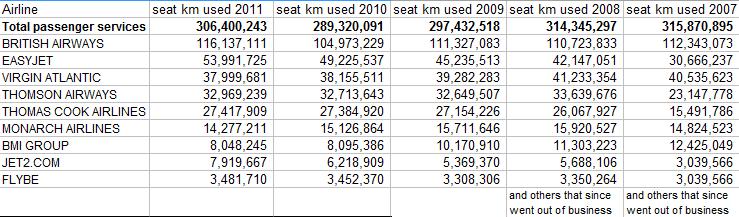 Figures from the CAA show a lot of data about all the UK airlines, including the number of passengers, number of seat kilometres available, number of seat kilomters flown, amount of cargo transported, percent of seat capacity used and so on. Figures show not only the airlines that have gone out of business since 2007, but the sharp rise of easyJet and other cheap airlines, the slight decline in passenger kilomtres of Virgin Atlantic, and the very small increase by British Airways between 2007 and 2011.