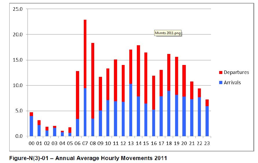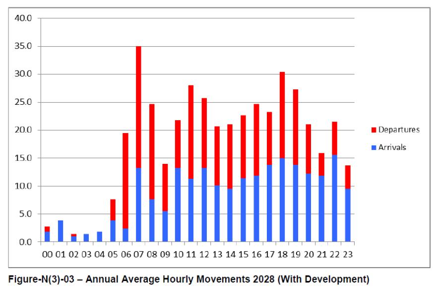 (*) Graphs of the current and proposed hourly arrivals and departures are provided below, taken from the Environmental Statement Appendix H Noise Appendix N(3) accompanying the planning application. Adding up the hourly movements at night between 23:00 and 07:00, the timeframe used for the night noise contours, shows the 50% increase projected by 2028 compared to 2011.