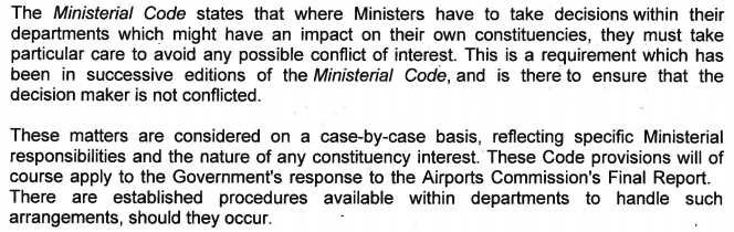 Sir Jeremy’s letter is equivocal, saying “These matters are considered on a case-by-case basis, reflecting specific Ministerial responsibilities and the nature of any constituency interest. These Code provisions will of course apply to the Government’s response to the Airports Commission’s Final Report”.