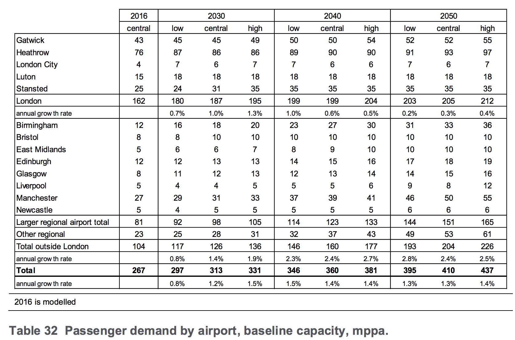7.18 Table 32 shows the scenario forecasts under baseline capacity. As the airports become full, the forecast demand range narrows and the annual rates of growth reduce. By around 2040 this effect is evident even in the low growth scenario.